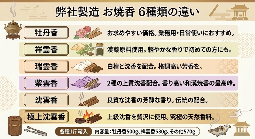 古来の儀軌に則り、沈香、白檀、丁香を始め数種の和漢香料にて調合、悪気を去り心識を清浄にする事はもとより、仏様を供養する事を念頭に謹製したものです。 原料はすべて天然の香料を調合しております。