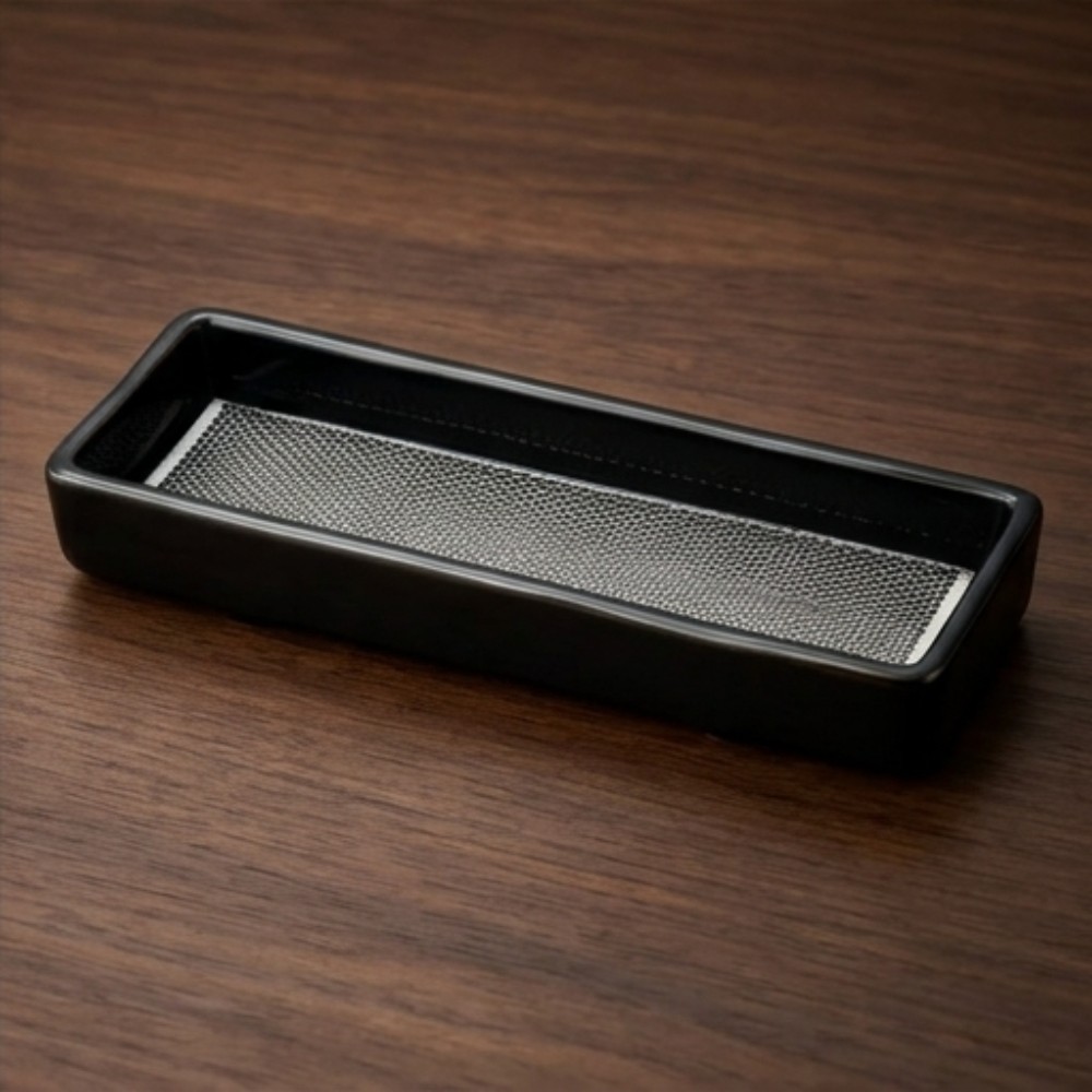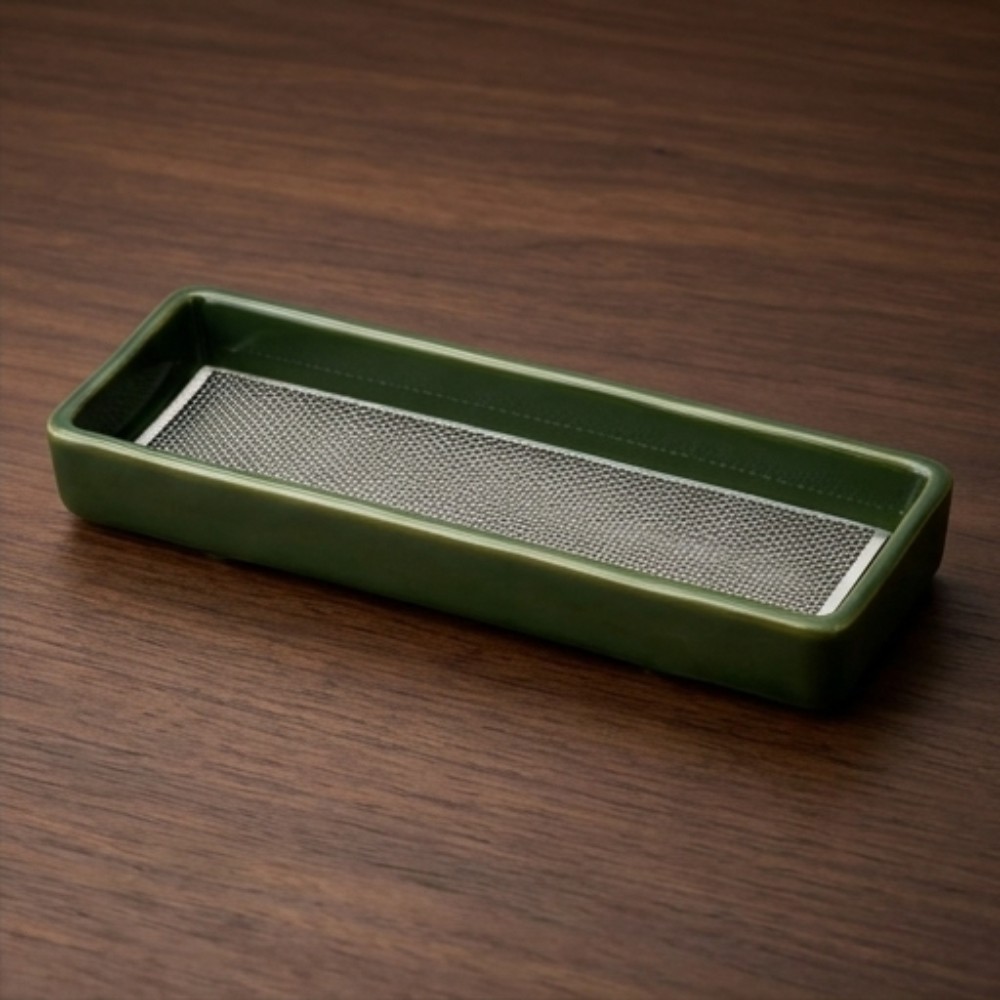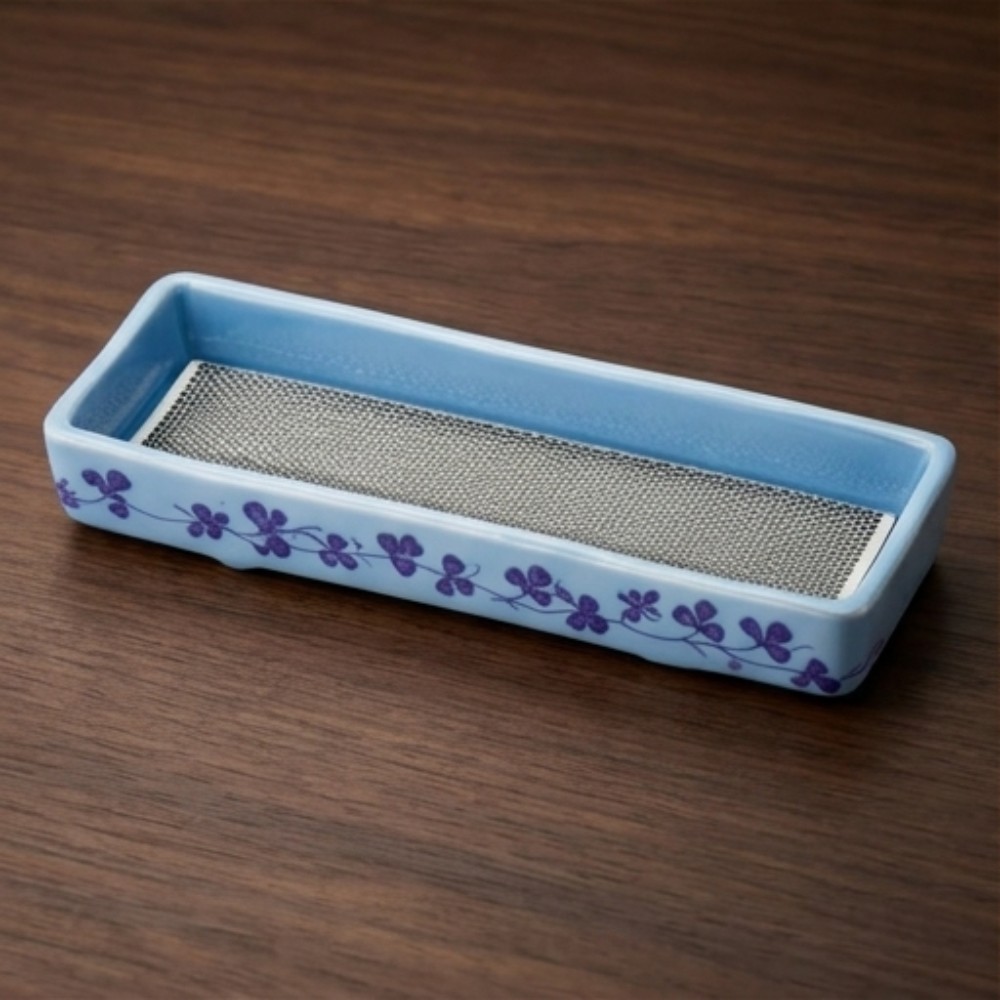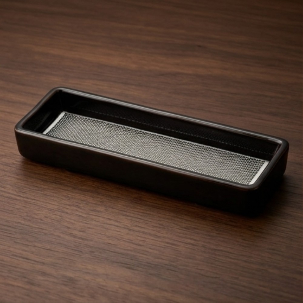 従来の縦置き型の線香立てと異なり、線香を横に寝かせて焚くことで、燃え残りを少なくし、安全性を高めた新しいスタイルの香炉皿となっています。