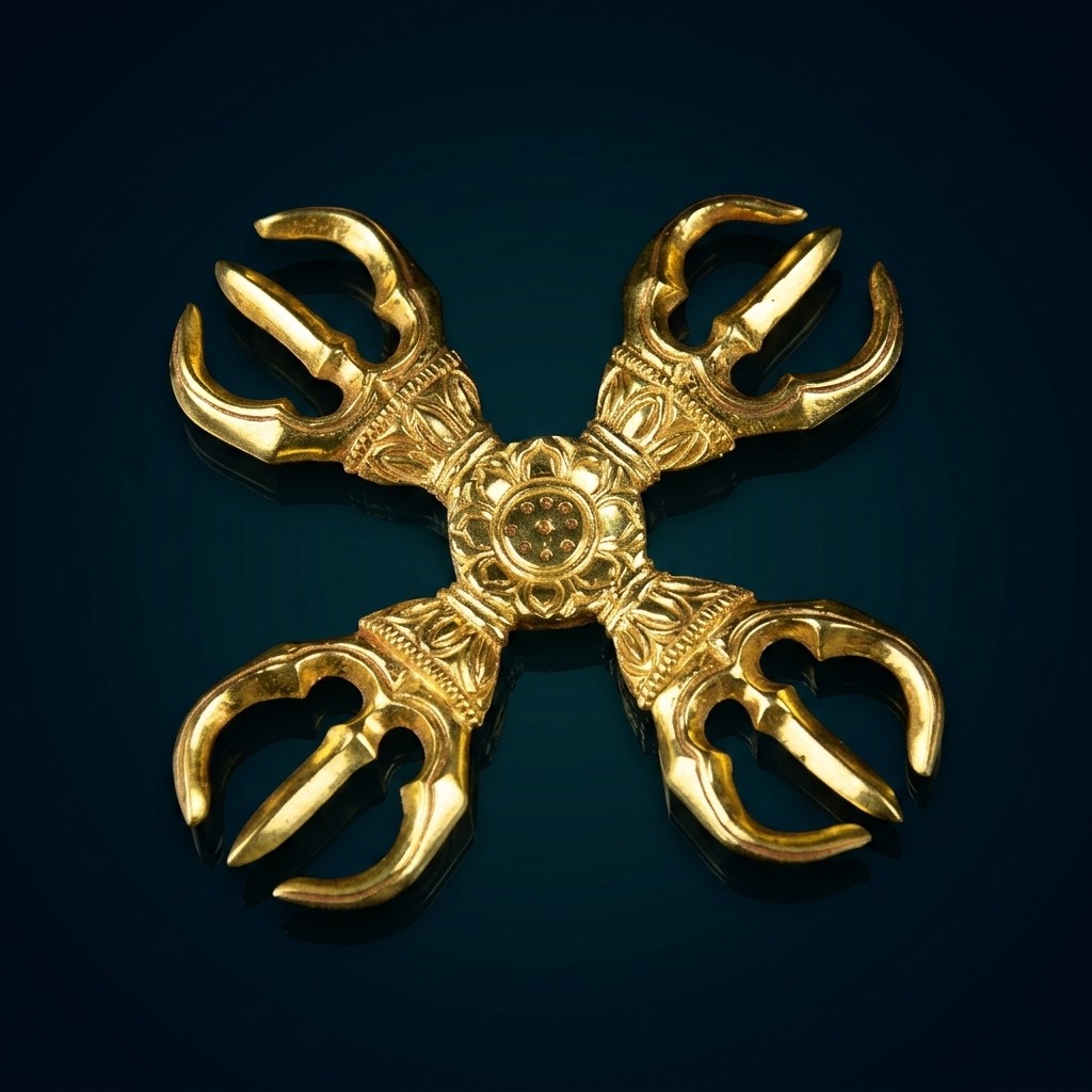 この法具は古代インドの武器を起源とし、金剛杵の形を十字に組み合わせたデザインが特徴です。