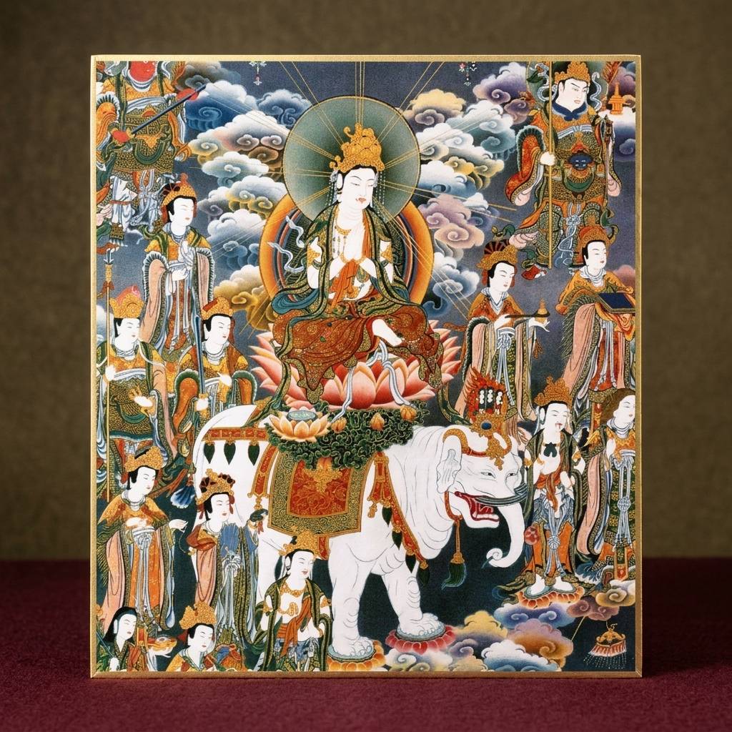 一切にわたる最もすぐれた善を説く菩薩、普賢菩薩の姿を描いた美しい仏画色紙です。鮮やかな彩色で丁寧に描き上げられたその姿は、見る者の心を瞬時に捉えて離しません。