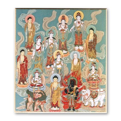 あらゆる障害を取り除く最強の守護者、五大明王を描いた迫力満点の仏画色紙です。不動明王、降三世明王、軍荼利明王、大威徳明王、金剛夜叉明王の五尊が一堂に会した、この上なく頼もしい一枚を、ぜひあなたの心の支えにしてみてはいかがでしょうか。